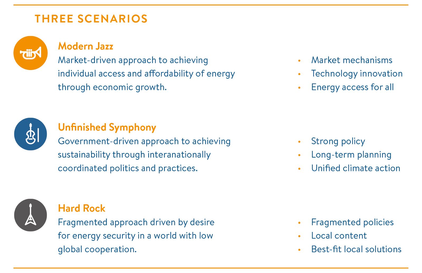 Die Szenarien bieten einen integrativen und strategischen Rahmen, der ein großangelegtes Denken ermöglicht. Sie sollen als Set verwendet werden, um zu erforschen und zu steuern, was passieren könnte, und einen qualitativ hochwertigeren globalen strategischen Dialog über die Zukunft der Energiesysteme zu unterstützen.